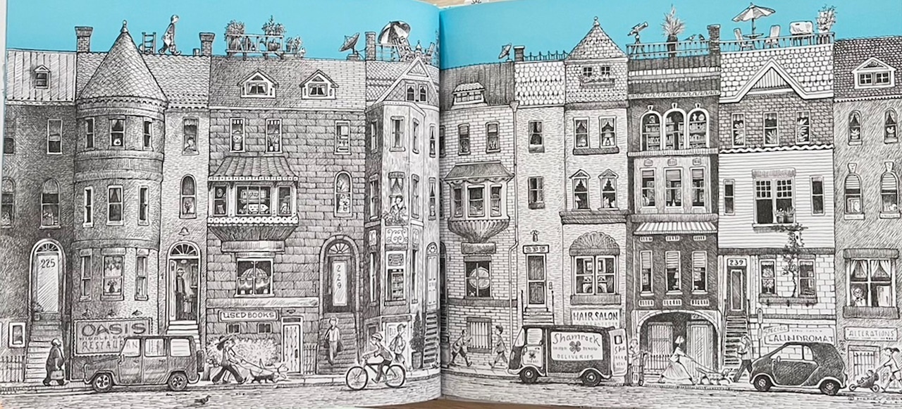 黒と青で表現された、緻密な描写が美しい文章のない絵本です。
