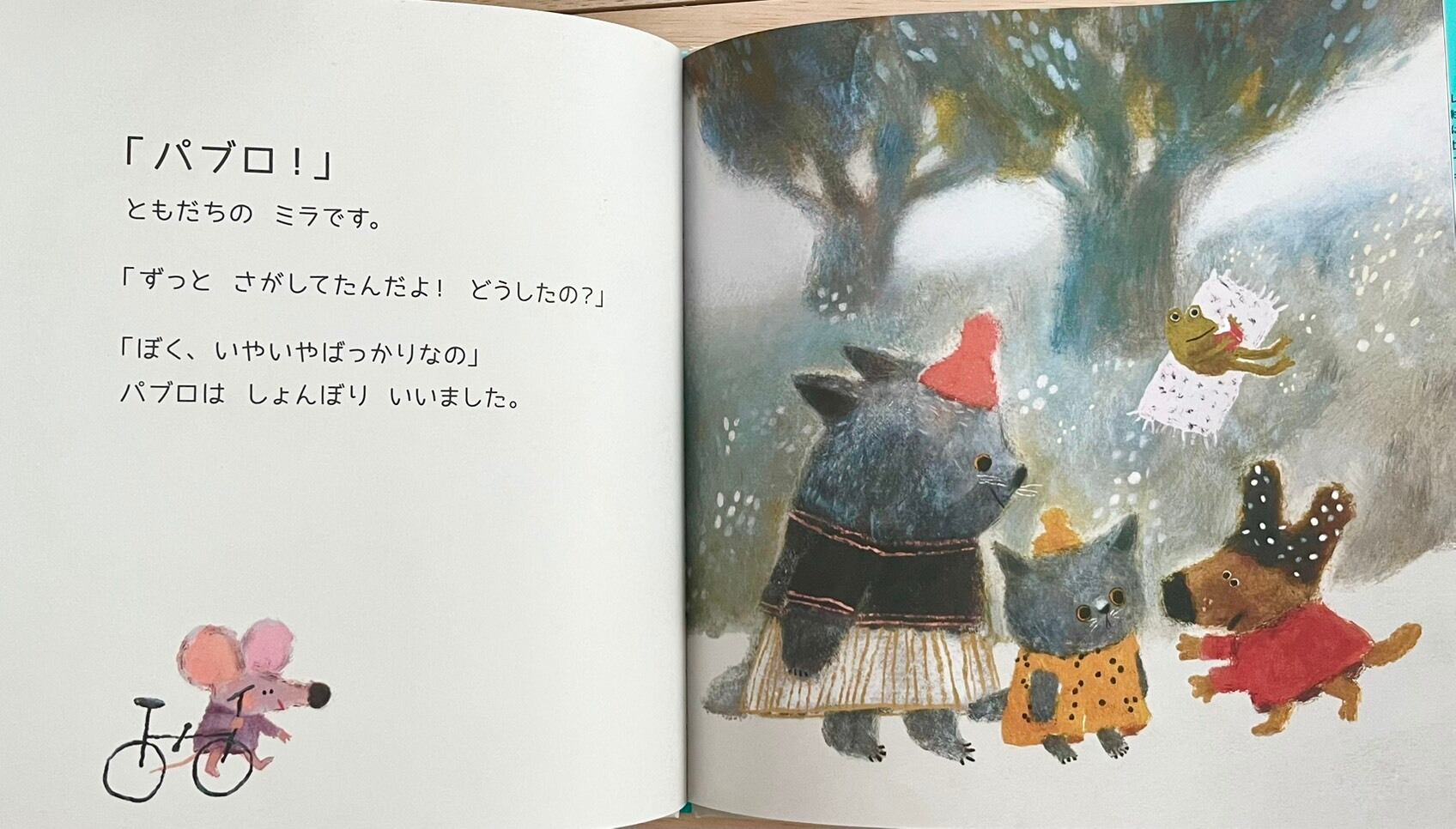 「いやいや」に取りつかれているパブロ。そこに友だちのミラが登場し、「いやいやがとまらない」としょんぼりするパブロをやさしく抱きしめてくれます。ミラのやさしさのおかげで、パブロはすべり台をみんなで楽しみ、みんなに笑顔が広がります。最後には「次はみんなでプールに行こう!」とすっかり元気を取り戻しました。