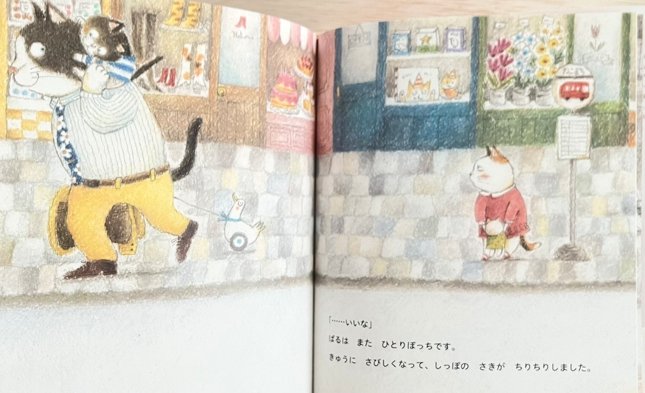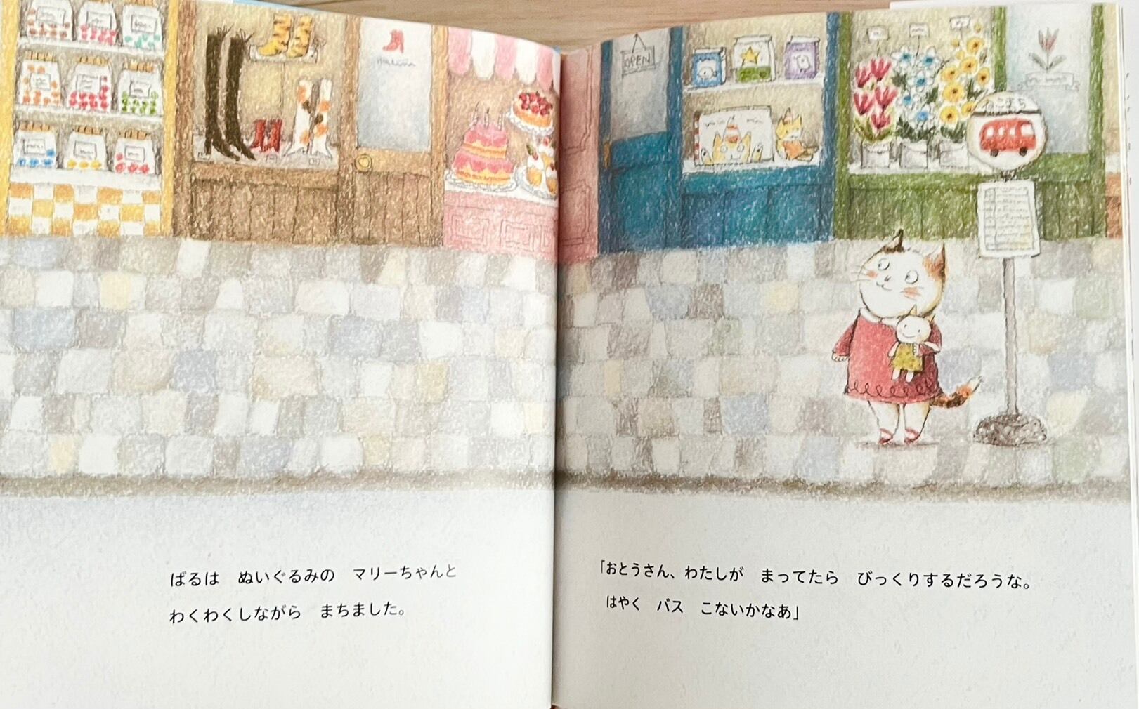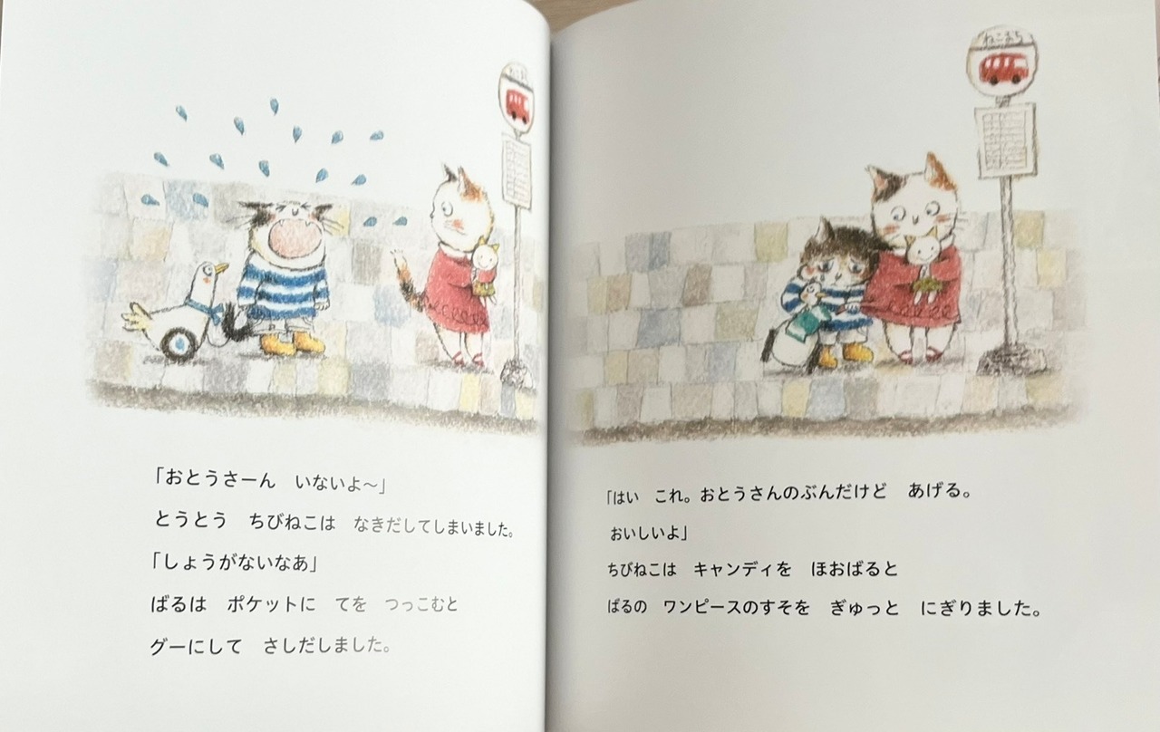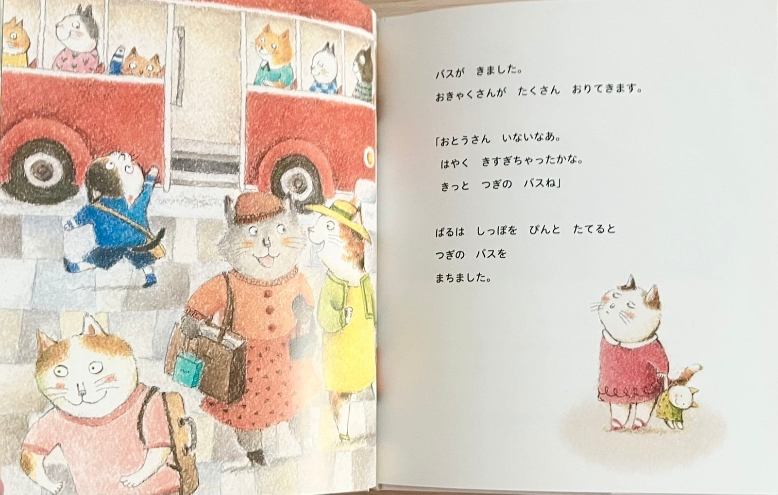 子猫のばるは、新しい靴を履いてバス停までお父さんをおむかえにいきました。