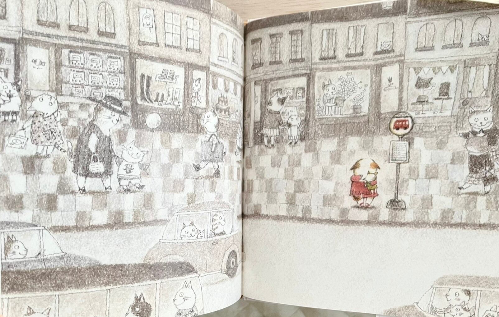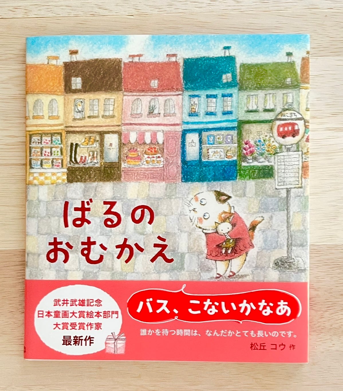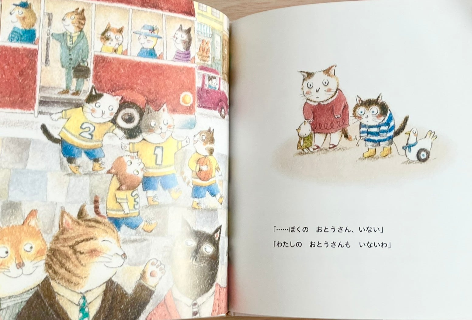 子猫のばるは、新しい靴を履いてバス停までお父さんをおむかえにいきました。