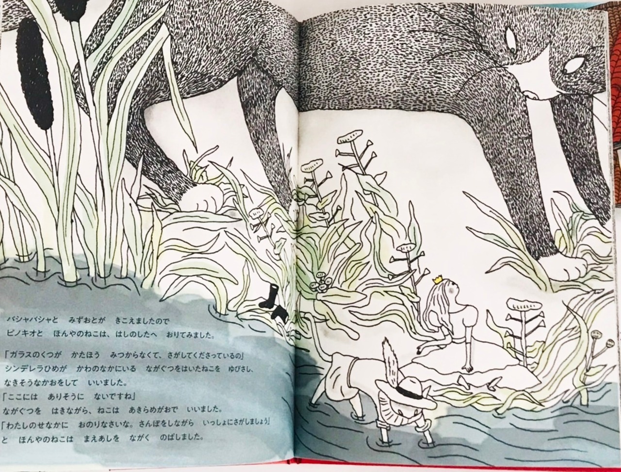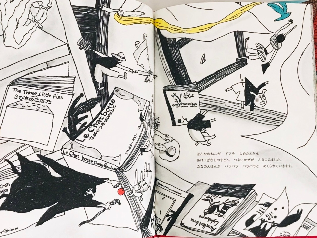 窓から強い風が入りこみ、本の中からシンデレラや長靴をはいたねこたちを窓の外へ吹き飛ばしてしまいました。