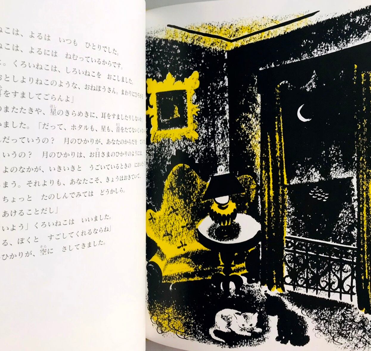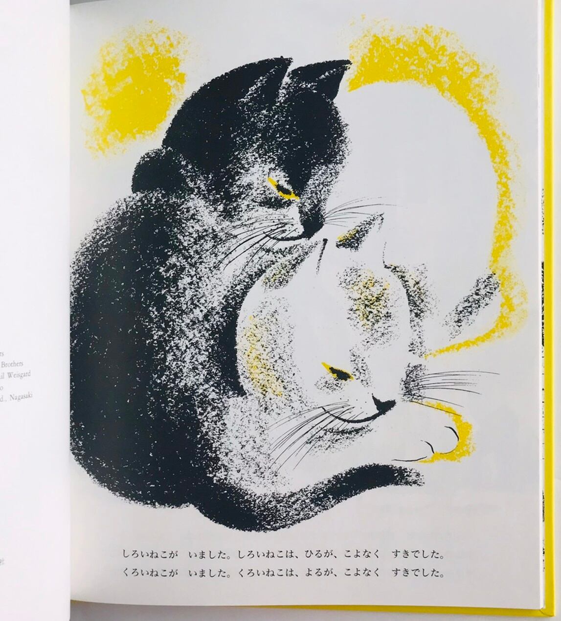 昼が好きな白いねこと、夜が好きな黒いねこがいました。白いねこは黒いねこに昼を、黒いねこは白いねこに夜を、それぞれ案内します。お互いの世界を知った2ひきはしだいに…。