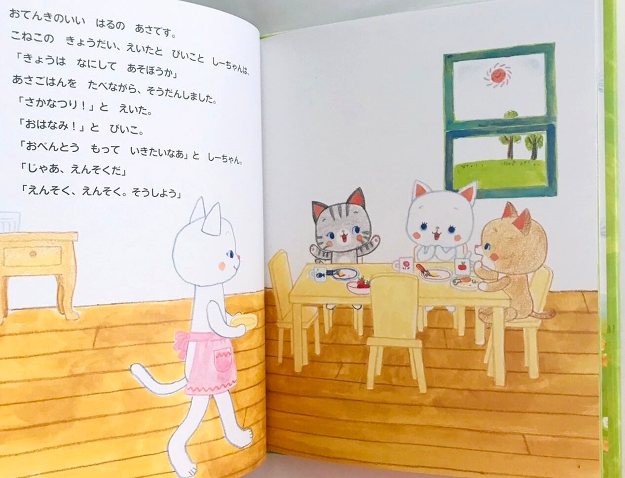 こねこのきょうだいは、元気いっぱいに、えんそくへ出発!